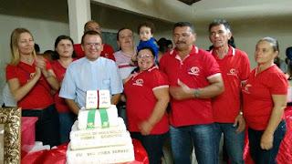 Em seguida, de forma surpresa, foi servido um jantar de confraternização com a partilha do bolo comemorativo ao som da filarmônica Santa Cecília e todos participaram de forma fraterna e feliz pela missão confiada ao nosso Pároco nesses 19 anos de caminhada como Sacerdote.